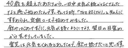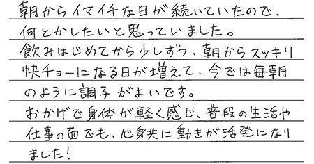 飲み始めてから、全く悩みもなくなり、むしろ20代の頃より元気に毎日過ごせています!